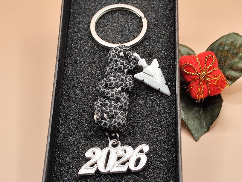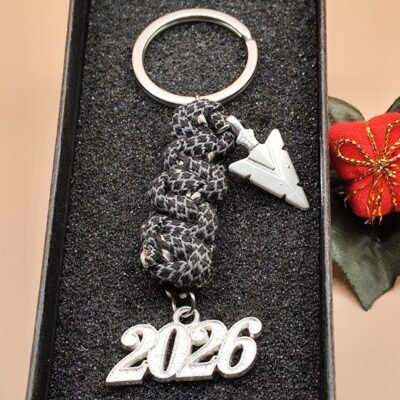 Χειροποίητο μπρελόκ – γούρι φτιαγμένο με κορδόνι χοντρό σε πλέξη και ατσάλινο στοιχείο.