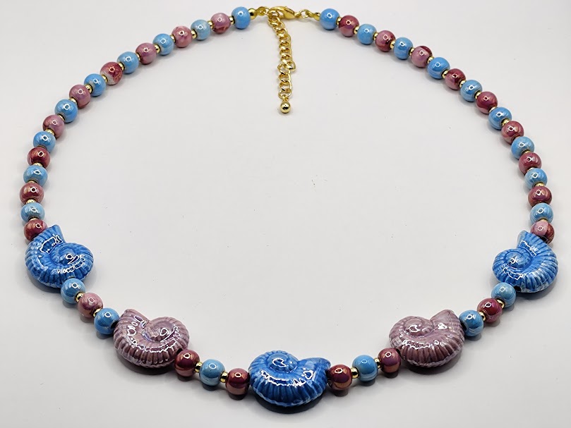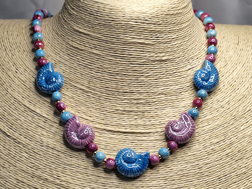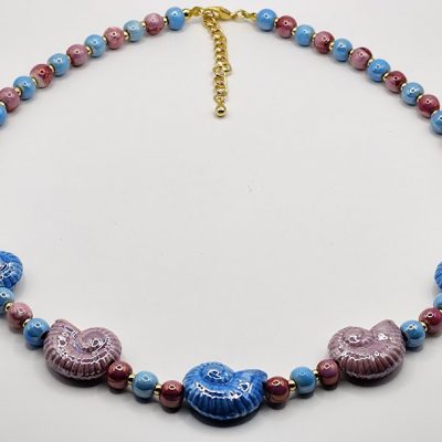 Χειροποίητο κολιέ, φτιαγμένο με κεραμικές χάντρες και σαλιγκάρια με διάφορα χρώματα επισμαλτωμένα.