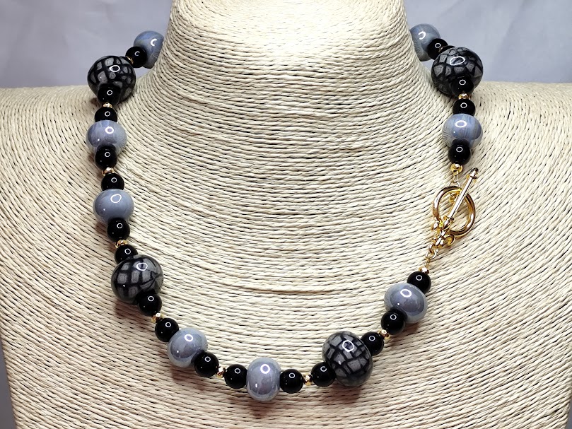 Χειροποίητο κολιέ,κομψό και διαχρονικό,με κεραμικές χάντρες μεγάλες επισμαλτωμένες και μικρές μαύρες.Ιδιαίτερο κούμπωμα επιχρυσωμένο 18 – 24κ.
