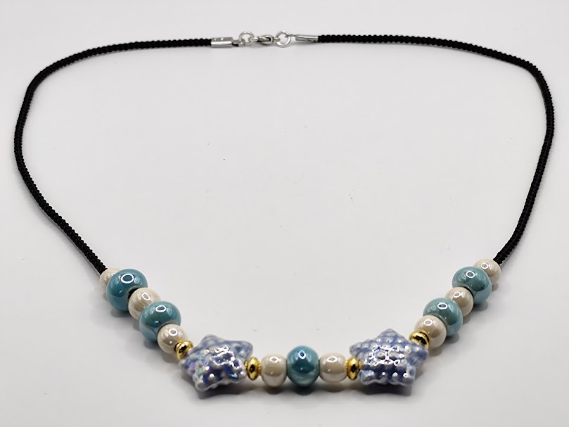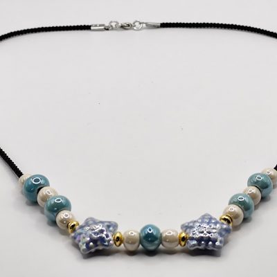 Χειροποίητο κολιέ απλο και κομψό φτιαγμένο με μαύρο πλεκτό κορδόνι , κεραμικές χάντρες και αστερίες επισμαλτωμένα.
