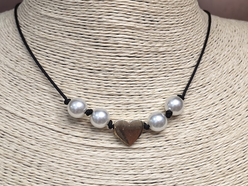 Χειροποίητο κολιέ, φτιαγμένο με πέρλες, κεντρικό στοιχείο επιχρυσωμένη 18-24k καρδιά, σε μαύρο κορδόνι.