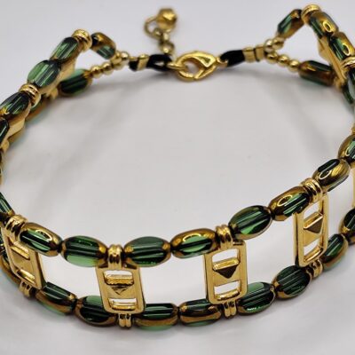 Χειροποίητο φαρδυ βραχιόλι κομψό με σμαραγδί κρύσταλλους που έχουν και μια πινελιά χρυσή και επιχρυσωμένα στοιχεία 18 -24k.