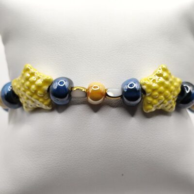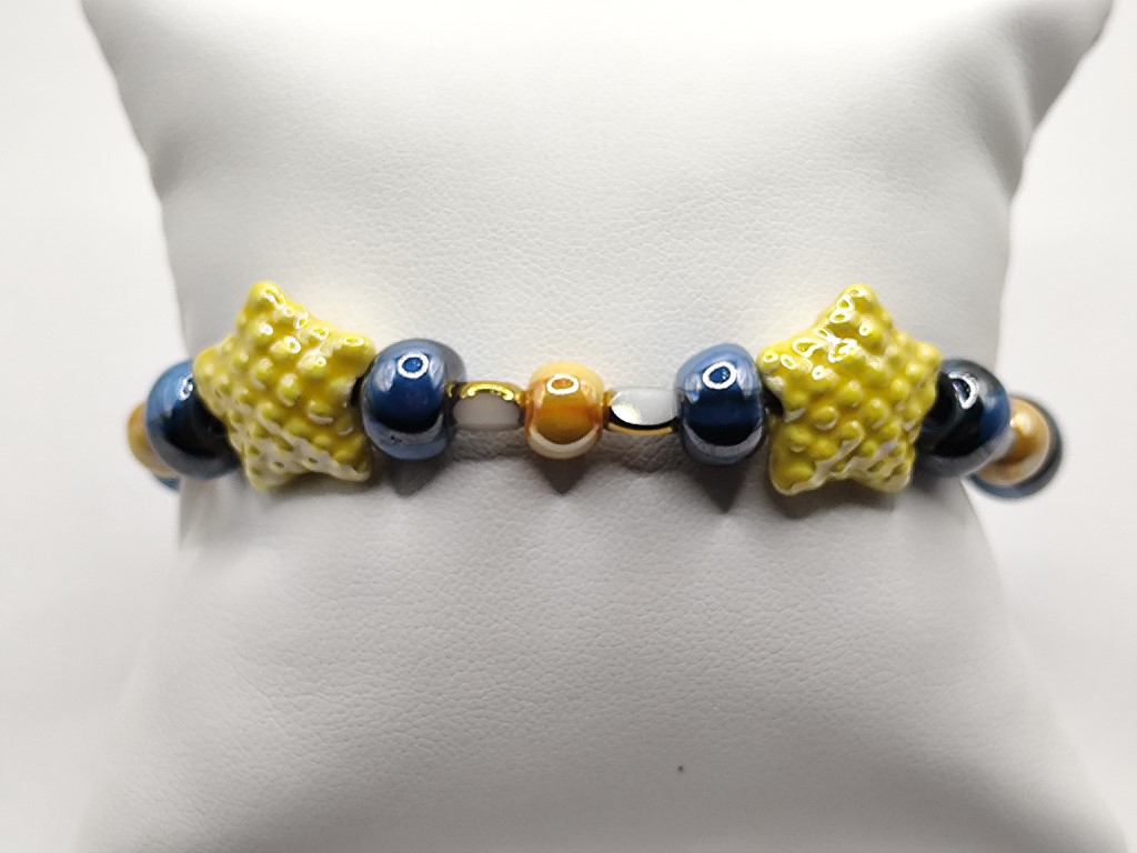 Χειροποίητο βραχιόλι εντυπωσιακο με κεραμικές χάντρες και αστερίες επισμαλτωμένα και χάντρες άσπρες με χρυσές πινελιές.