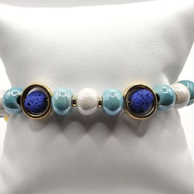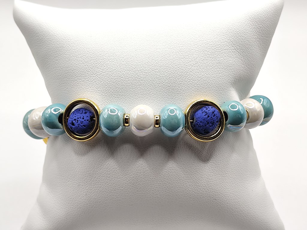 Χειροποίητο βραχιόλι φτιαγμένο με κεραμικές χάντρες με επισμάλτωση και λάβα περασμένη μέσα σε επιχρυσωμενους κρίκους