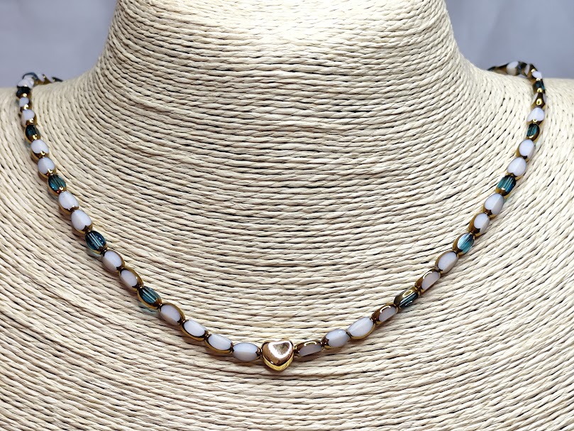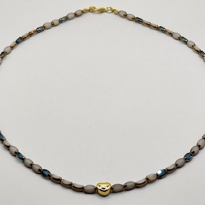 Χειροποίητο κολιέ, φτιαγμένο με άσπρες και τυρκουάζ χάντρες και κεντρικό στοιχείο επιχρυσωμένη 18-24k καρδούλα.