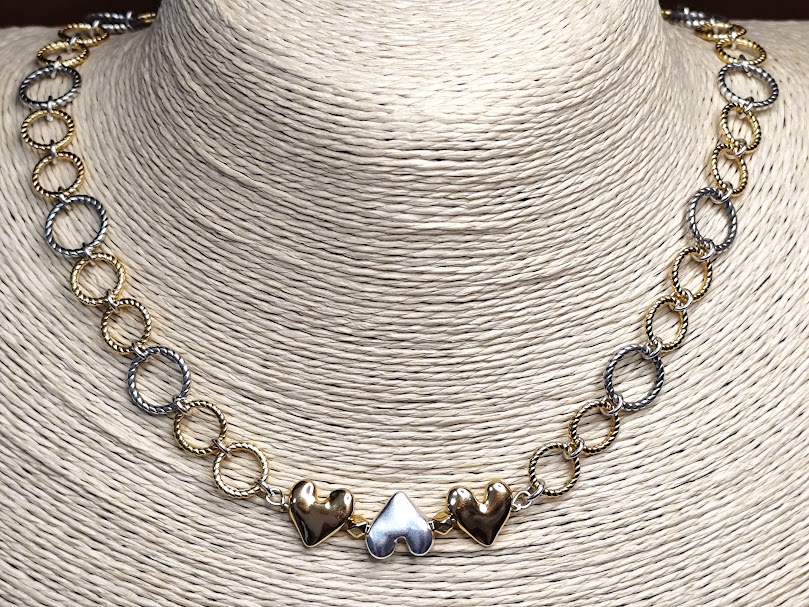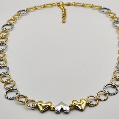 Χειροποίητο κολιέ δίχρωμο, φτιαγμένο με κρίκους και καρδιές από ανοξείδωτο ατσάλι και επιχρυσωμένα 18-24k για αντοχή και διαχρονική λάμψη.