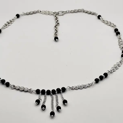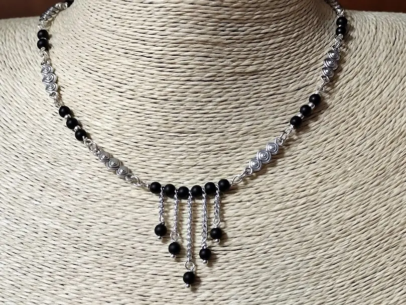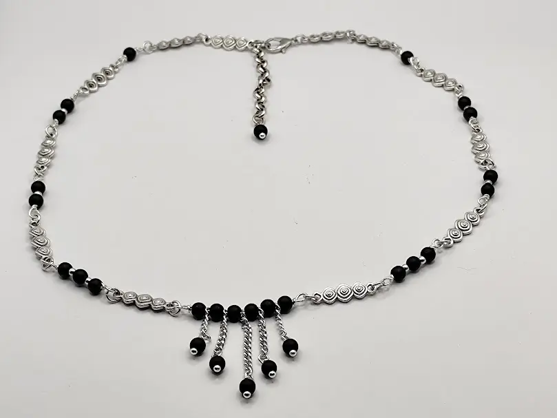 Χειροποίητο κολιέ φτιαγμένο με ατσάλινα μοτιφ και μαύρες χάντρες.