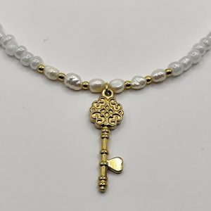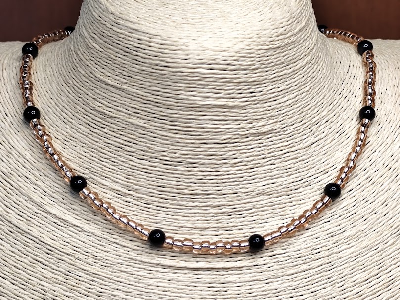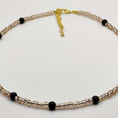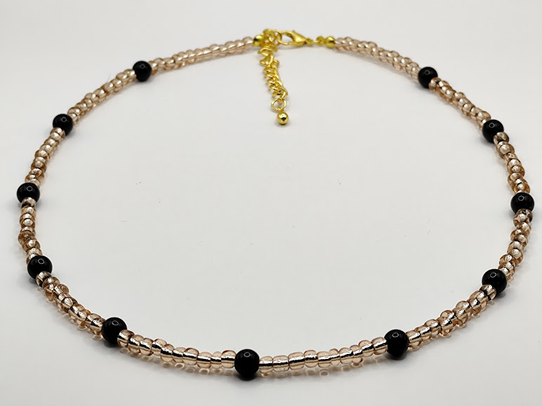 Χειροποίητο κολιέ, φτιαγμένο με χάντρες χρώματος χρυσαφί και μαύρες.