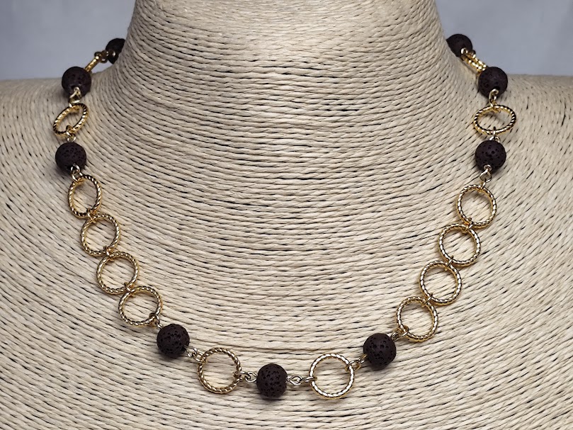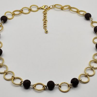 Χειροποίητο κολιέ με κρίκους επιχρυσωμένους 18-24k σε συνδυασμό με καφέ λάβα.