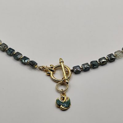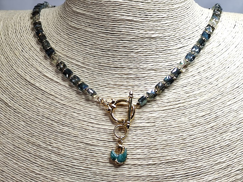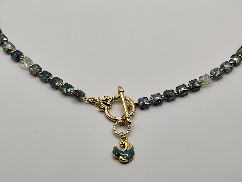 Κομψό χειροποίητο κολιέ, φτιαγμένο με ιριδίζον κρύσταλλους που αλλάζουν χρωματισμό με το φώς, μπροστινό κούμπωμα και στοιχείο κύκνος με σμάλτο.