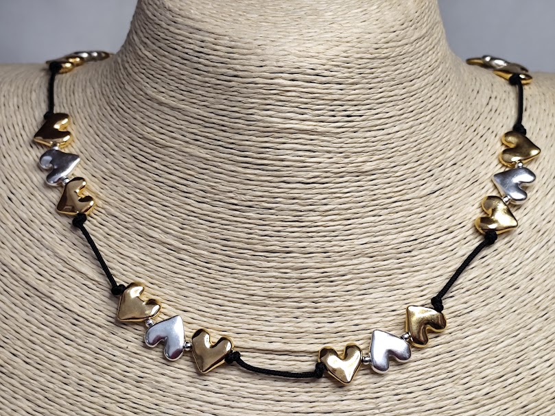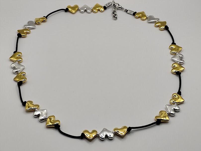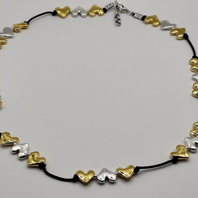 Χειροποίητο κολιέ δίχρωμο, φτιαγμένο με καρδιές από ατσάλι και επιχρυσωμένες 18-24k σε συνδυασμένες με μαύρο κορδόνι.