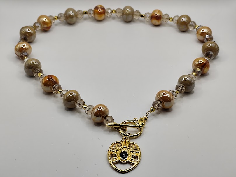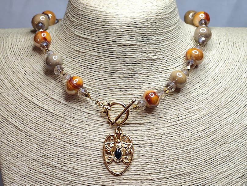 Εντυπωσιακό χειροποίητο κολιέ,με κεραμικές χάντρες επισμαλτωμένες διάφανους κρύσταλλους,μπροστινό κούμπωμα ιδιαίτερο με κρεμασμένο σκαλιστό στοιχείο με σμάλτο επιχρυσωμένα 18 – 24κ.