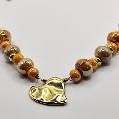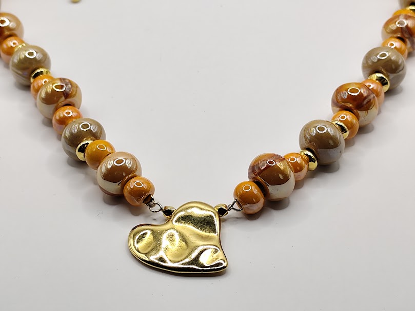 Εντυπωσιακό χειροποίητο κολιέ με μεγάλες και μικρές επισμαλτωμένες χάντρες, κεντρικό στοιχείο μεγάλη καρδιά επιχρυσωμένη 18-24k.