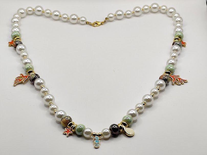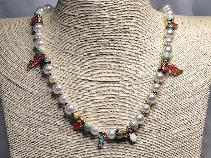 Χειροποίητο κολιέ, κομψό και διαχρονικό , φτιαγμένο με πέρλες , κεραμικές χάντρες επισμαλτωμένες και διάφορα επιχρυσωμένα 18-24k στοιχεία με σμάλτο.