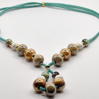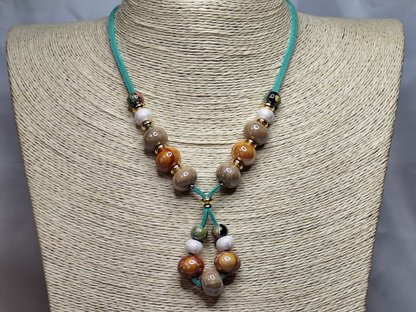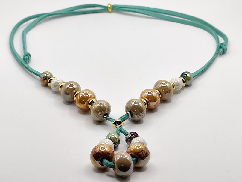 Χειροποίητο κολιέ, με κεραμικές χάντρες επισμαλτωμένες σε γήινα χρώματα και επιχρυσωμένα στοιχεία σε suede τιρκουάζ κορδόνι.