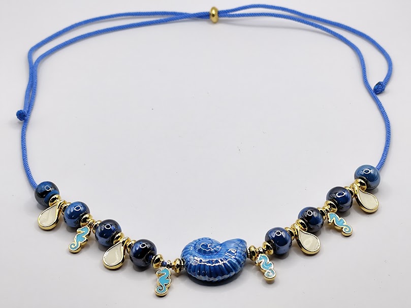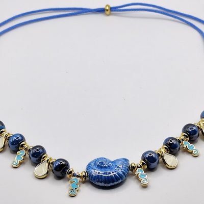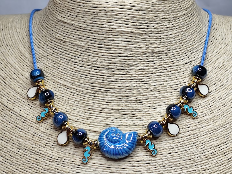 Χειροποίητο κολιέ δίχρωμο, με κεραμικές επισμαλτωμένες χάντρες, διάφορα μικρά επιχρυσωμένα στοιχεία με σμάλτο σε μπλέ κορδόνι.