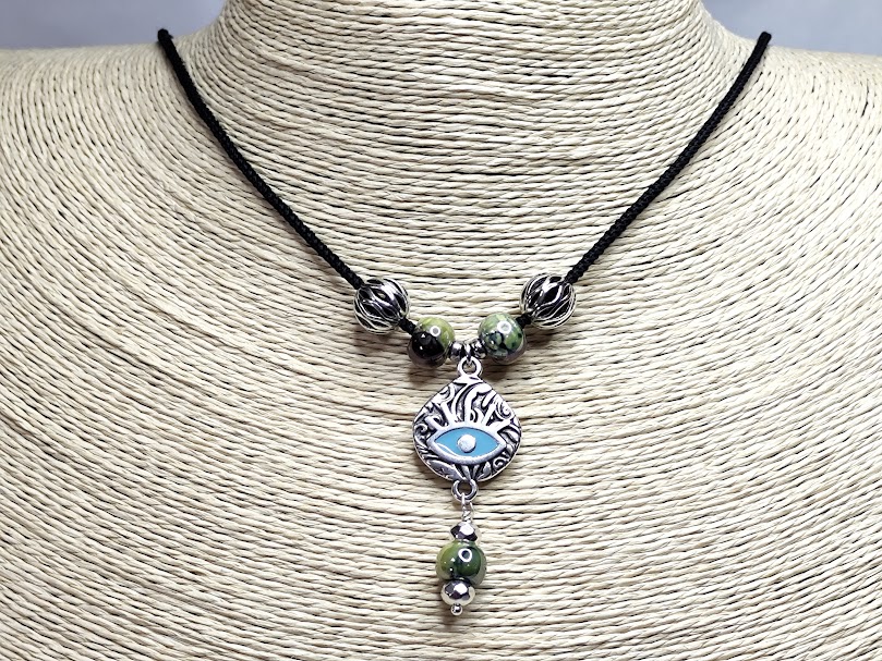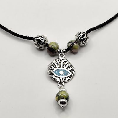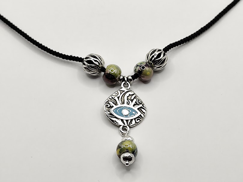 Χειροποίητο κολιέ, φτιαγμένο με κεραμικές χάντρες, επισμαλτωμένες και μεταλλικές , με στοιχείο ματάκι από ανοξείδωτο ατσάλι, σε μαύρο κορδόνι.