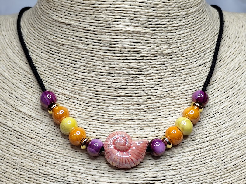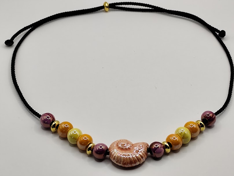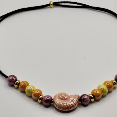 Χειροποίητο κολιέ, με κεραμικές χάντρες και σαλιγκάρι στο κέντρο, επισμαλτωμένα και με επιχρυσωμένες λεπτομέρειες σε μαύρο κορδόνι.