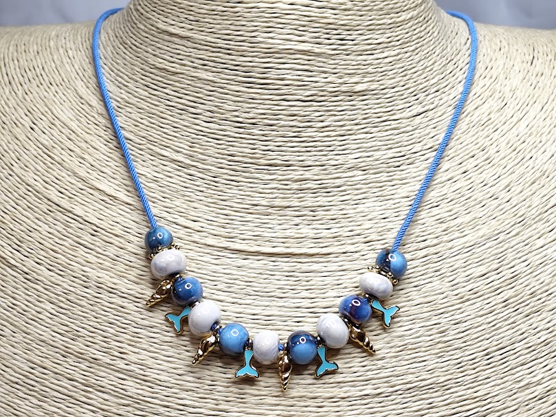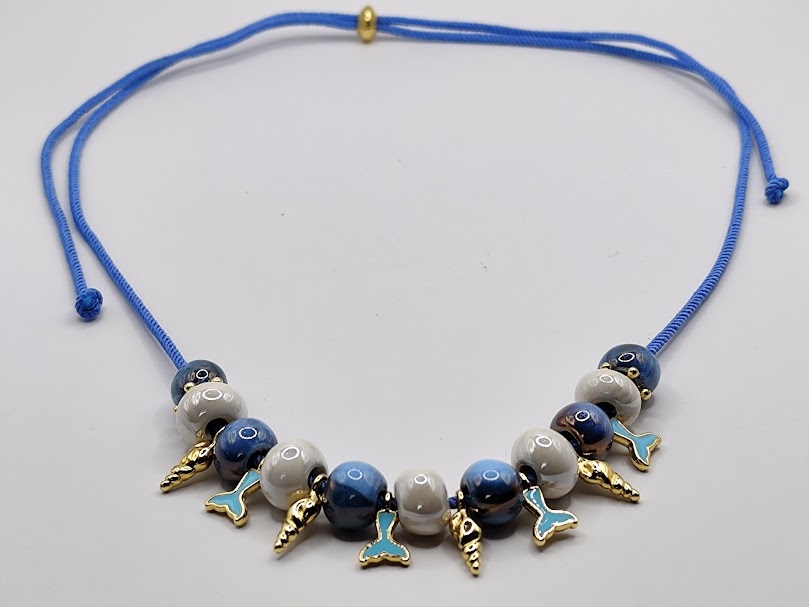 Χειροποίητο κολιέ δίχρωμο, με κεραμικές επισμαλτωμένες χάντρες, διάφορα μικρά επιχρυσωμένα στοιχεία με σμάλτο σε μπλέ κορδόνι.