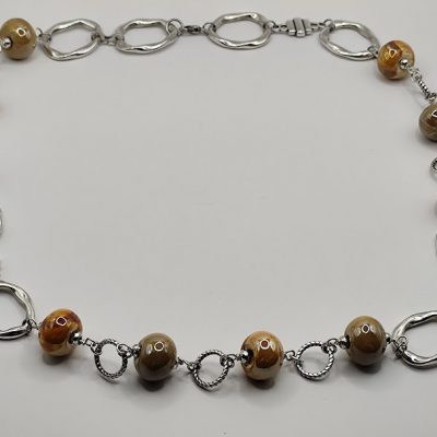 Εντυπωσιακό χειροποίητο κολιέ, φτιαγμένο με κεραμικές επισμαλτωμένες χάντρες, μεταλλικά μοτίφ και κρίκους από ανοξείδωτο ατσάλι.