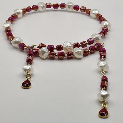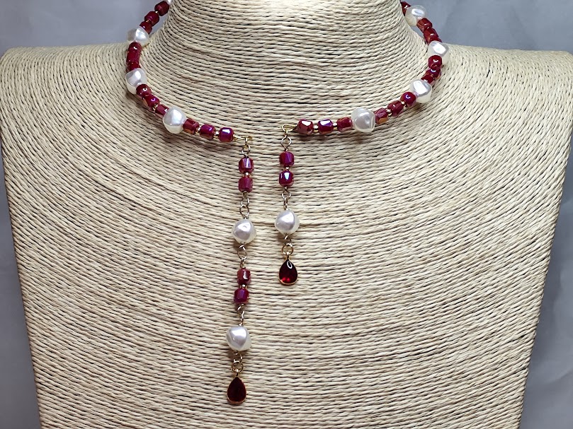 Εντυπωσιακό χειροποίητο κολιέ, φτιαγμένο με κρύσταλλους, ασύμμετρες πέρλες και στο τελείωμα στοιχείο δάκρυ με μπορντό σμάλτο.