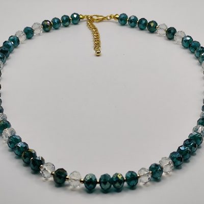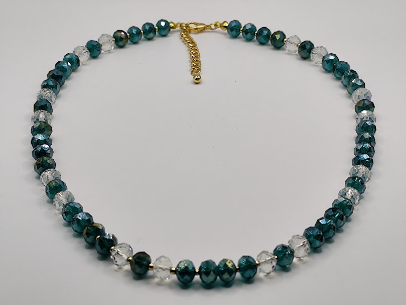 Χειροποίητο κολιέ, κομψό και απλό, δίχρωμο φτιαγμένο με σμαραγδί και διάφανους κρυστάλλους και χρυσές λεπτομέρειες.