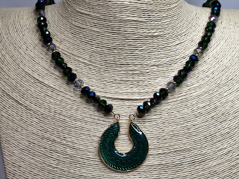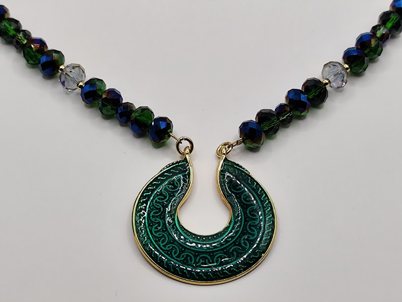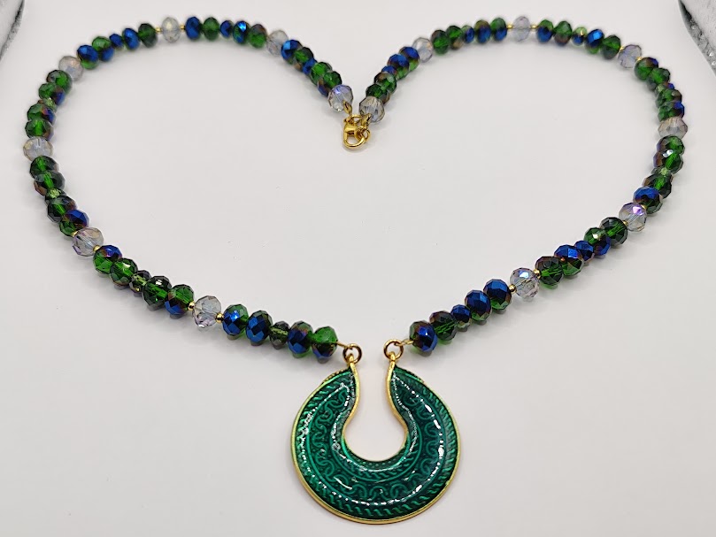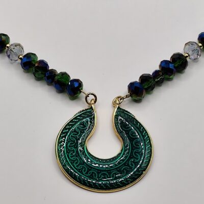 Εντυπωσιακό χειροποίητο κολιέ, φτιαγμένο με σμαραγδί κρύσταλλους και κεντρικό στοιχείο αιγυπτιακό με σμάλτο χρώματος σμαραγδί.