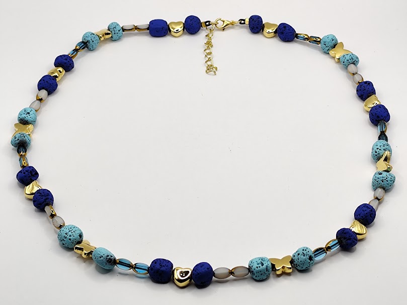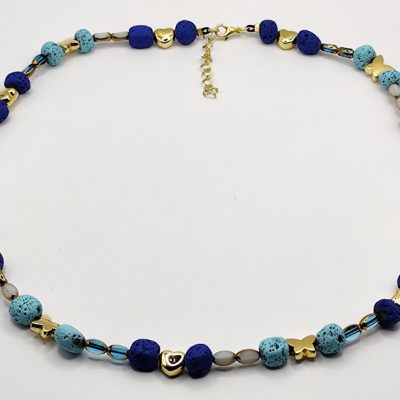Χειροποίητο κολιέ δίχρωμό, φτιαγμένο με λάβα, μπλέ ρουά και τιρκουάζ και διάφορα επιχρυσωμένα 18-24k στοιχεία.