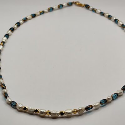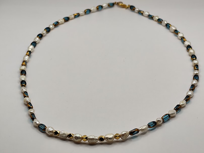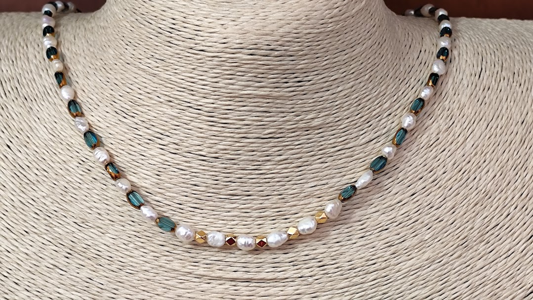 Χειροποίητο κολιέ δίχρωμο, φτιαγμένο με κρύσταλλους με χρυσή λεπτομέρεια και μαργαριτάρια.