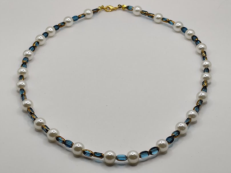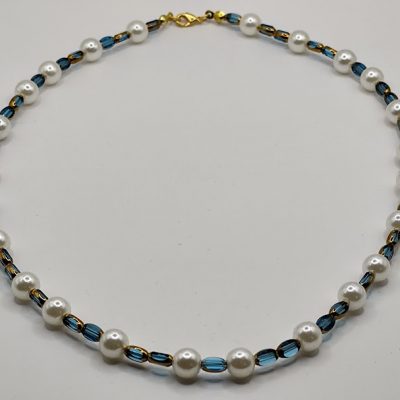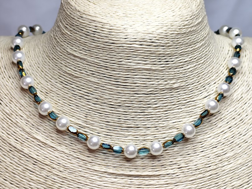 Κολιέ φτιαγμένο με πέρλες και κρυστάλλινες τυρκουάζ χάντρες.