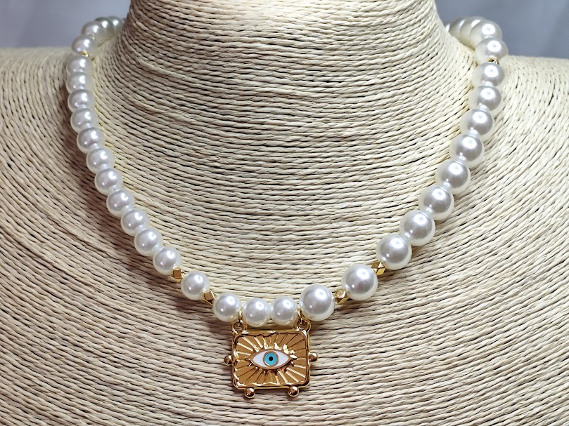 Εντυπωσιακό χειροποίητο κολιέ, κομψό και διαχρονικό, φτιαγμένο με πέρλες 2 μεγεθών , χρυσές λεπτομέρειες και στοιχείο ταυτότητα ματάκι επιχρυσωμένο 18-24k.