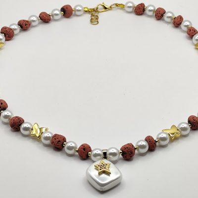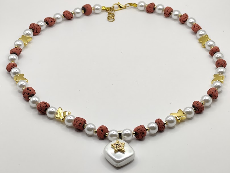 Χειροποίητο εντυπωσιακό κολιές, φτιαγμένο με κόκκινη λάβα, πέρλες επιχρυσωμένα στοιχεία 18-24k και κεντρικό στοιχείο σχήματος ρόμβου με λεπτομέρεια αστέρι.