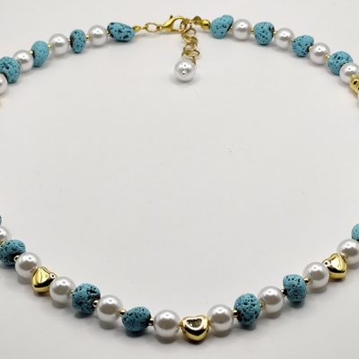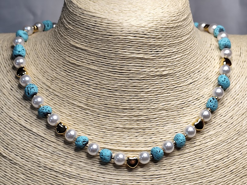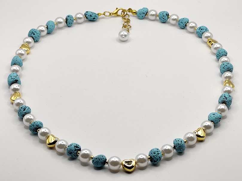Χειροποίητο κολιέ δίχρωμο κομψό και διαχρονικό, φτιαγμένο με τιρκουάζ λάβα, πέρλες , χρυσές λεπτομέρειες και επιχρυσωμένες καρδούλες 18-24k.