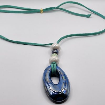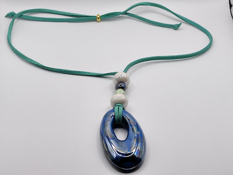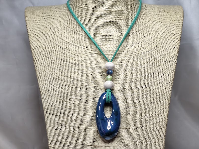 Χειροποίητο κολιέ, φτιαγμένο με κεραμικές χάντρες επισμαλτωμένες και μεγάλο κεραμικό στοιχείο σε αποχρώσεις μπλέ ρουα σε suede τιρκουάζ κορδόνι.