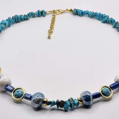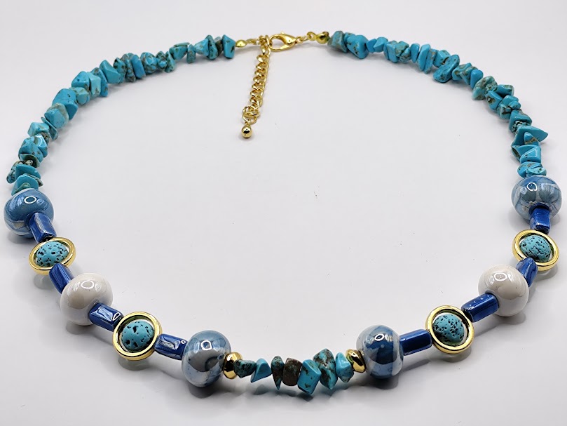 Χειροποίητο κολιέ, φτιαγμένο με προσοχή στην λεπτομέρεια, με διάφορες κεραμικές χάντρες επισμαλτωμένες, λάβα μέσα σε κρίκους επιχρυσωμένους και τιρκουάζ τσίπς κοραλιού.