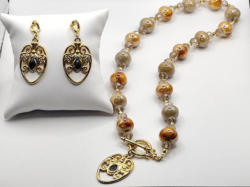 Χειροποίητο σετ που αποτελείται απο κολιέ 57 cm και σκουλαρίκια 5 cm, φτιαγμένο με κεραμικές χάντρες επισμαλτωμένες μπροστινό κούμπωμα με στοιχείο . Όλα τα μεταλλίκα στοιχεία είναι επιχρυσωμένα 18 – 24κ