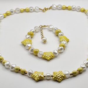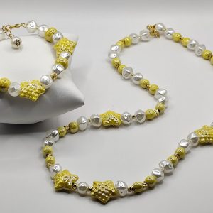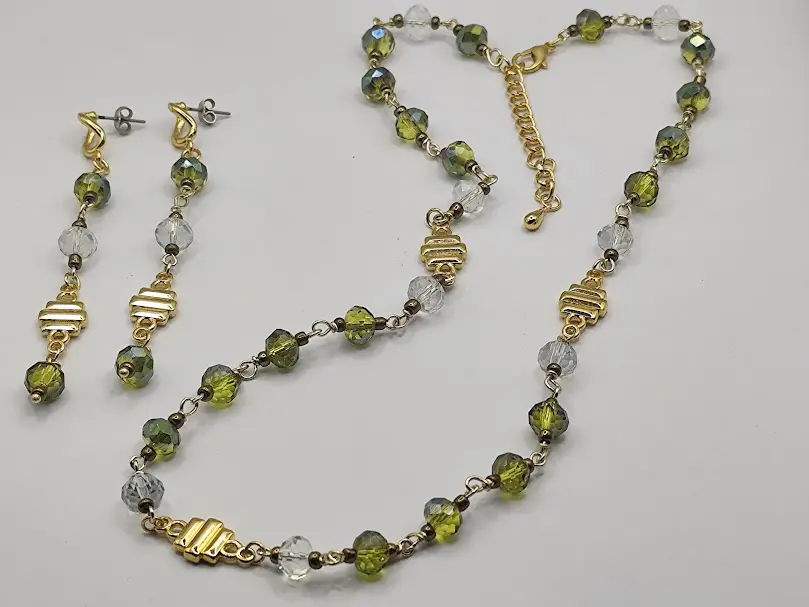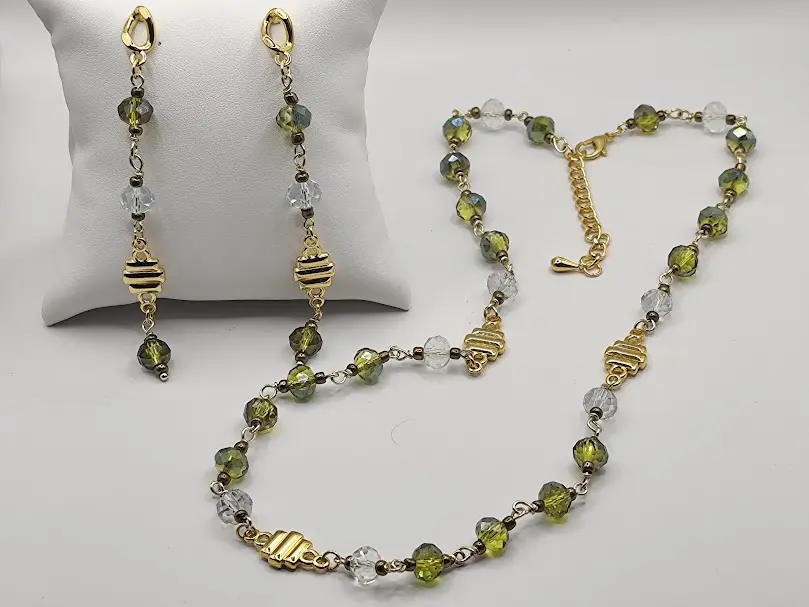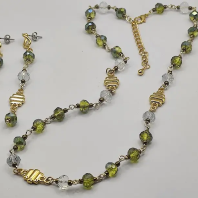 Χειροποίητο σετ που αποτελείται απο κολιέ 53 cm επέκταση 5 cm και σκουλαρίκια 8 cm.Είναι φτιαγμένο απο χάντρες και επιχρυσωμένα μοτιφ 18-24κ.