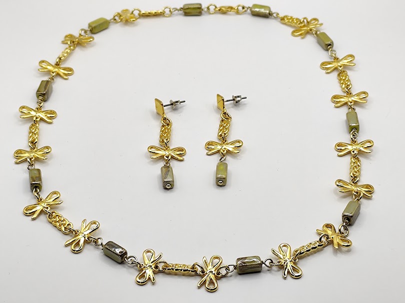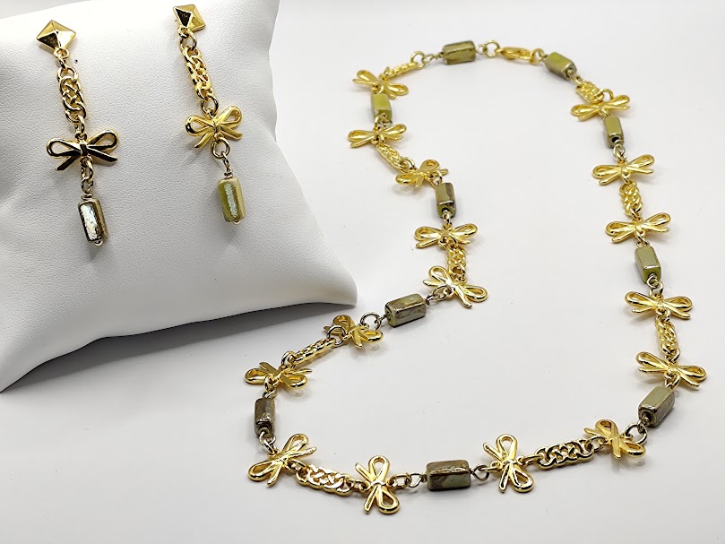 Χειροποίητο σετ που αποτελείται από κολιέ 50cm και σκουλαρίκια 5cm . Φτιαγμένο με μοτίφ στυλ αλυσίδας και μοτίφ φιογκάκια επιχρυσωμένα 18-24k και κεραμικές χάντρες με επισμάλτωση.