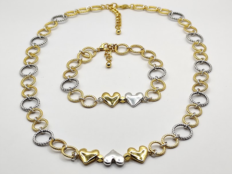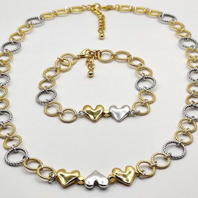 Χειροποίητο σετ δίχρωμο που αποτελείται από κολιέ 44cm με επέκταση 5cm και βραχιόλι 20cm. Φτιαγμένο με κρίκους και καρδές από ανοξείδωτο ατσάλι και επιχρυσωμένα 18-24k.
