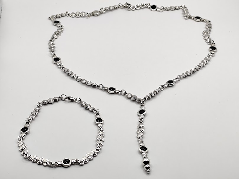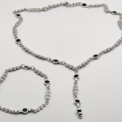 Χειροποίητο σετ που αποτελείται από κολιέ 54cm και βραχιόλι 21cm. Φτιαγμένο με ατσάλινα μοτίφ και πινελίες μαύρου σμάλτου.