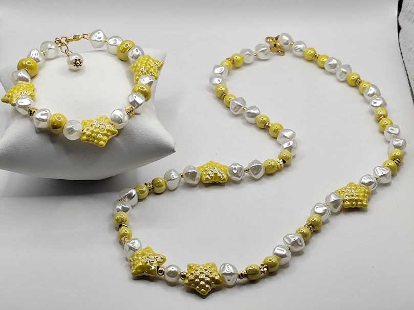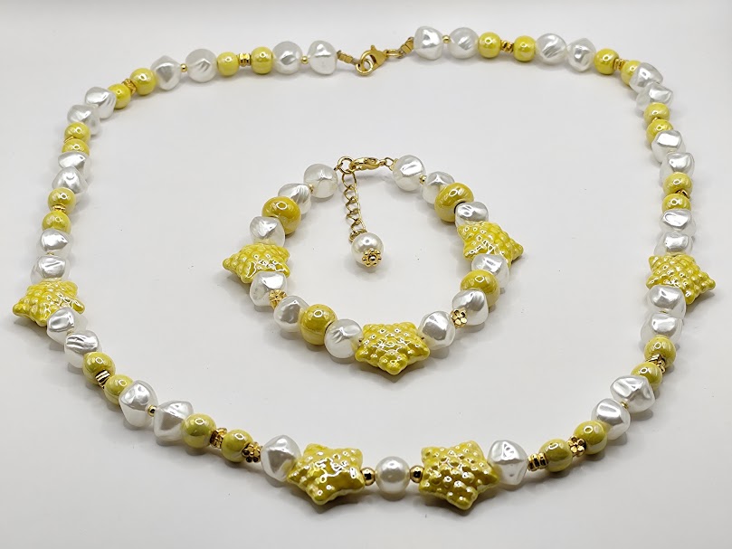 Χειροποίητο σετ δίχρωμο που αποτελείται από κολιέ 50cm και βραχιόλι 20cm με επέκταση 2cm. Φτιαγμένο με κίτρινες κεραμικές χάντρες και αστέριες με επισμάλτωση και ασύμμετρες πέρλες.