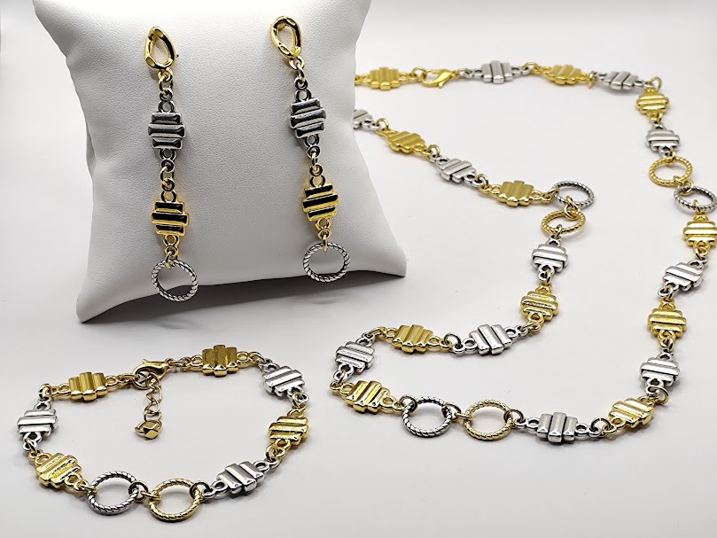 Χειροποίητο σετ δίχρωμο που αποτελείται απο κολιέ 60 cm βραχιόλι 19 cm και σκουλαρίκια 7 cm ,φτιαγμένο με μεταλλικά μοτίφ και κρίκους από ανοξείδωτο ατσάλι και επιχρυσωμένα με 18 – 24κ