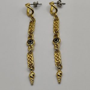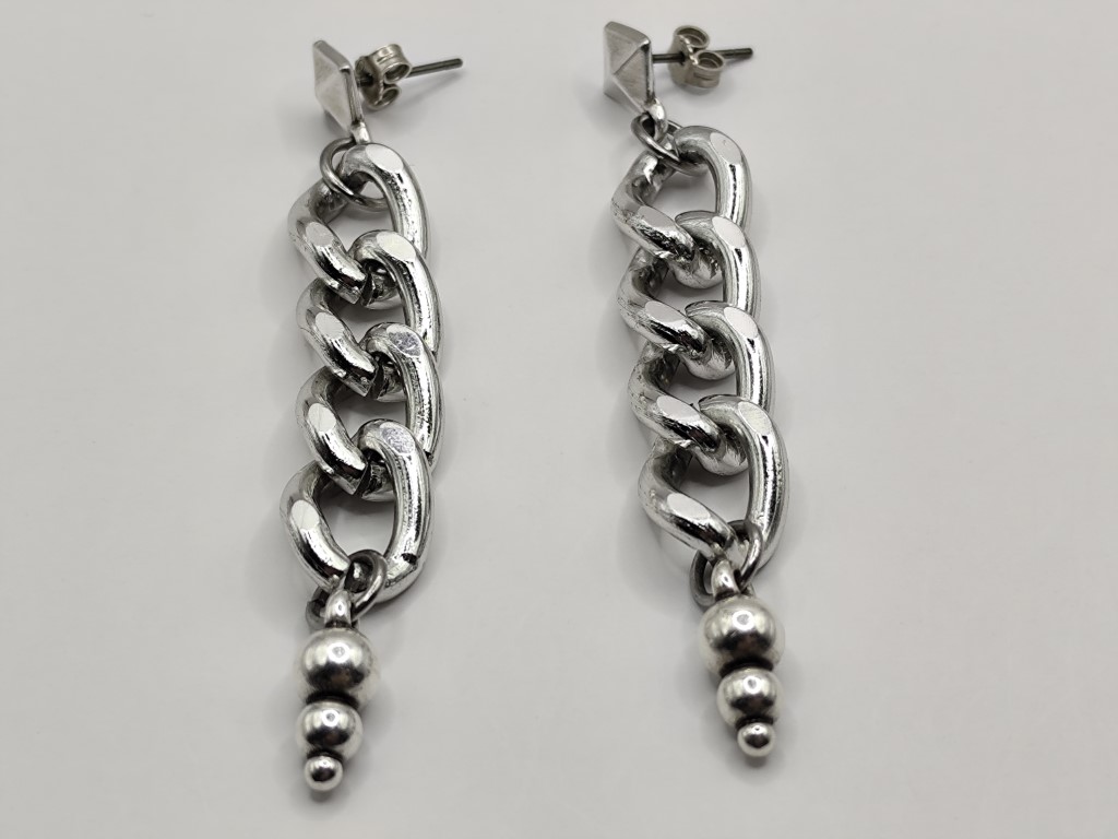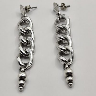 Χειροποίητα μακριά σκουλαρίκια, φτιαγμένα με μεταλλική αλυσίδα και στο τελείωμα τους μεταλλικό ανοξείδωτο στοιχείο.