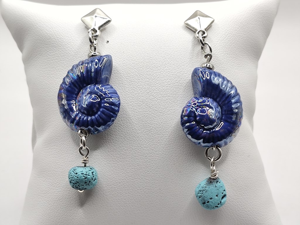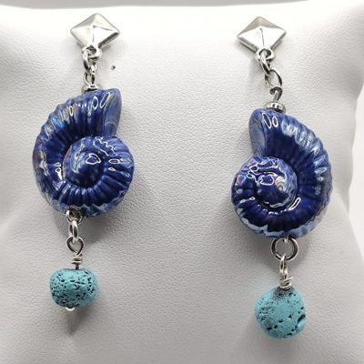 Χειροποίητα μακριά σκουλαρίκια φτιαγμένα με κεραμικά σαλιγκάρια επισμαλτωμένα, τιρκουάζ λάβα.