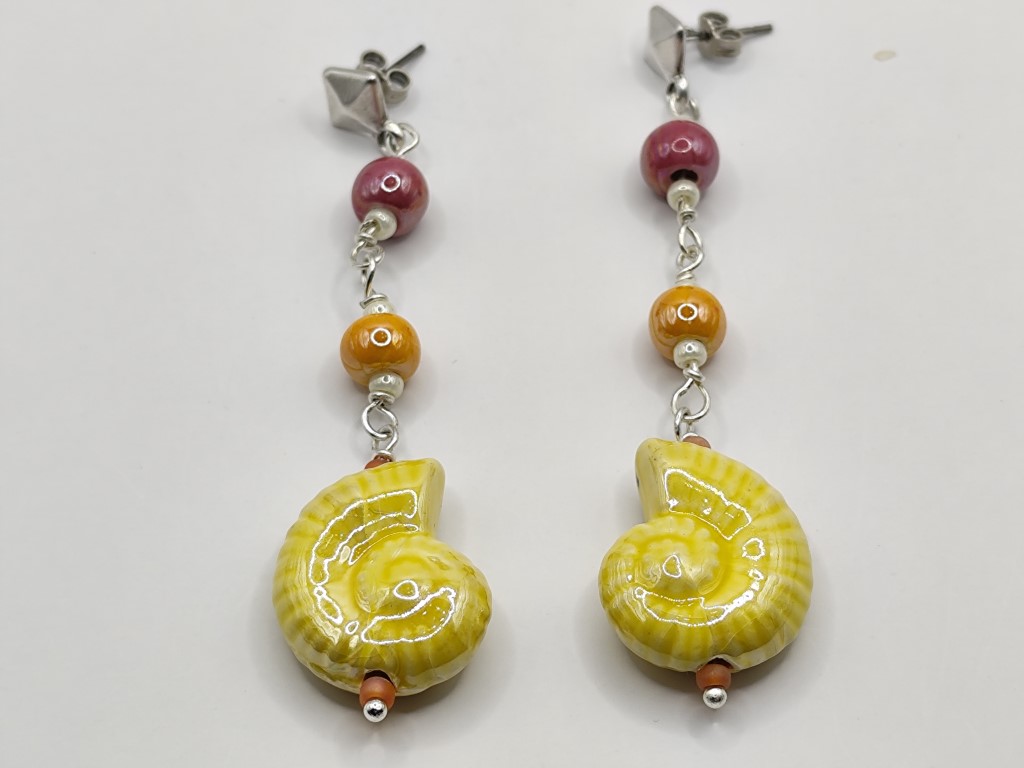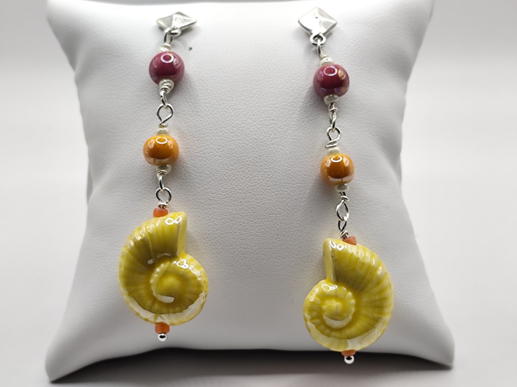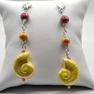Χειροποίητα μακριά σκουλαρίκια, φτιαγμένα με κεραμικές χάντρες και σαλιγκάρια με επισμάλτωση σε μεταλλική απόχρωση.