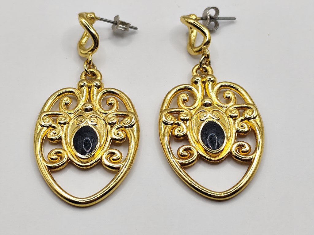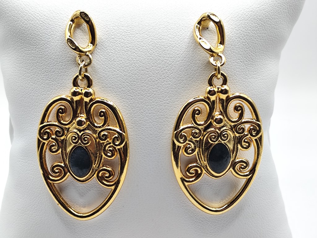Χειροποίητα μακριά σκουλαρίκια σχήματος οβάλ, ιδιαίτερα με σκάλισμα και γκρί σμάλτο επιχρυσωμένα 18-24k.