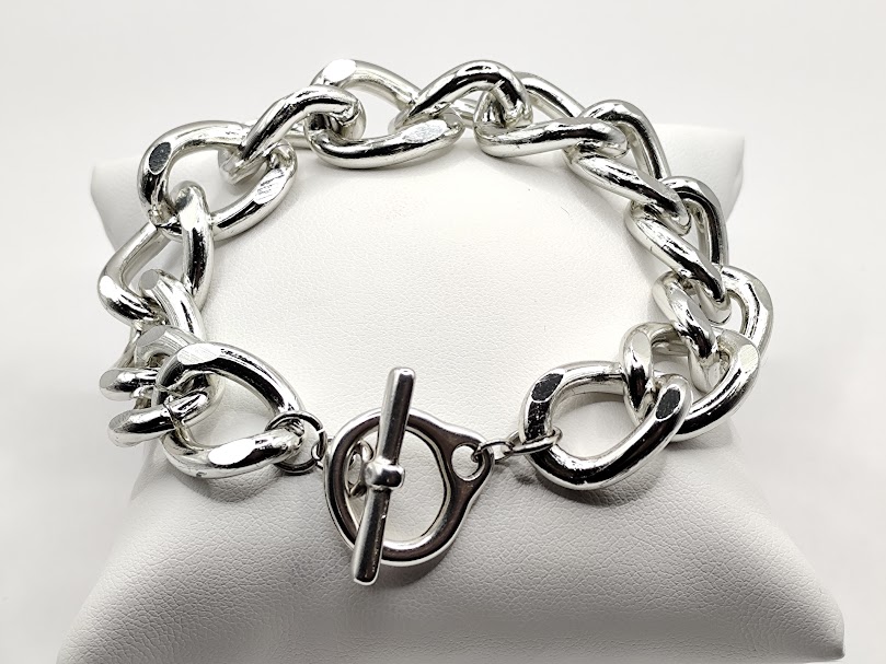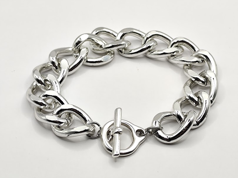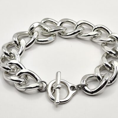 Χειροποίητο βραχιόλι από χοντρή και φαρδιά αλυσίδα. Το κούμπωμα του είναι ιδιαίτερο και προσθέτει μια φινέτσα στο βραχιόλι.Είναι από μέταλλο επαργυρωμένο και εχει ανθεκτικότητα.