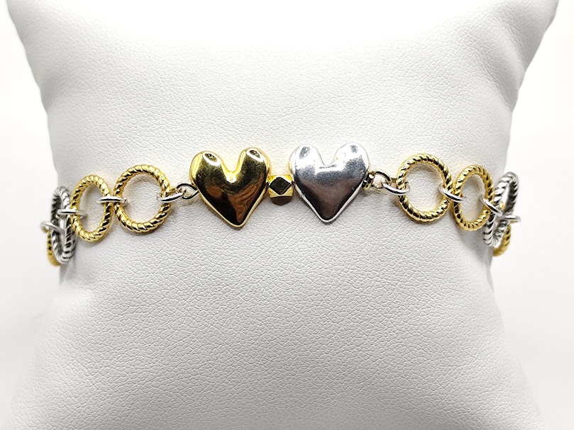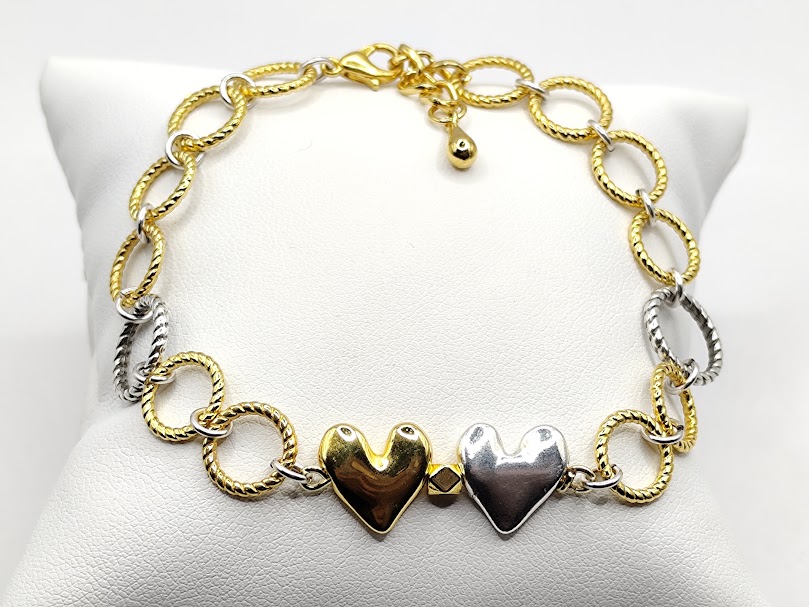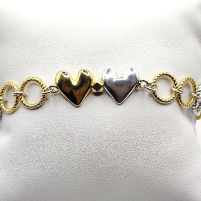 Χειροποίητο βραχιόλι φτιαγμένο με προσοχή στην λεπτομέρεια δίχρωμο με κρίκους διαφορετικού μεγέθους και καρδιές.Τα μεταλλικά στοιχεία και το κούμπωμα είναι από ανοξείδωτο ατσάλι απλό ή επιχρυσωμένα 18 -24κ