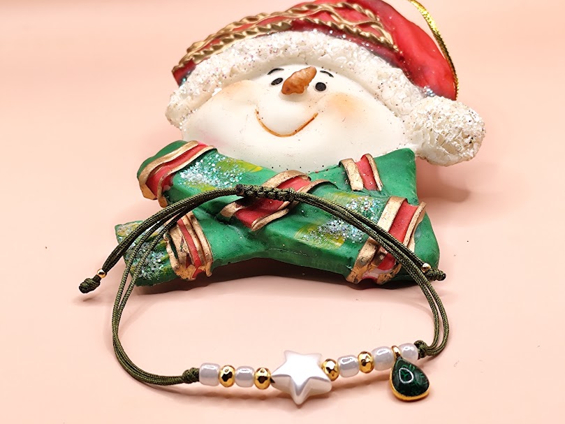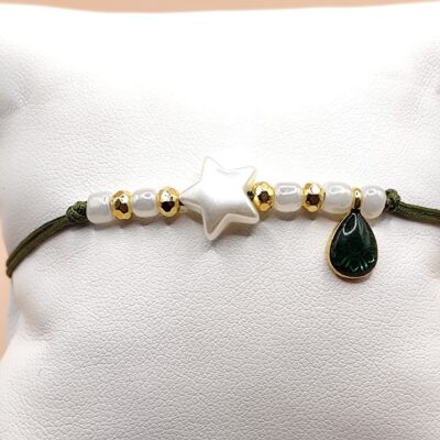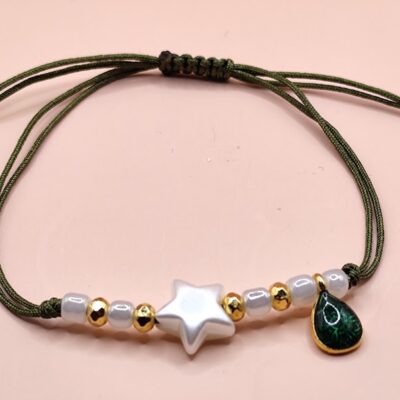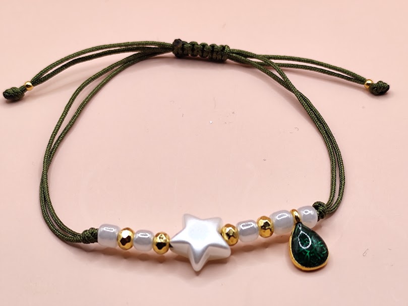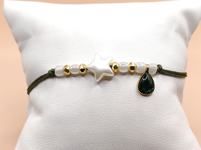 Χειροποίητο βραχιόλι φτιαγμένο με χάντρες πέρλα σε σχήμα αστέρι και στοιχείο με σμαραγδί σμάλτο σε πράσινο κορδόνι.