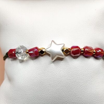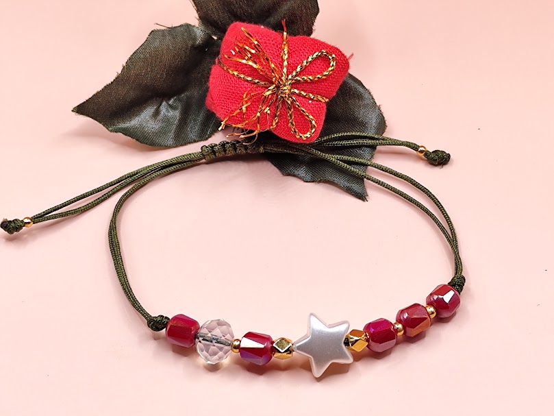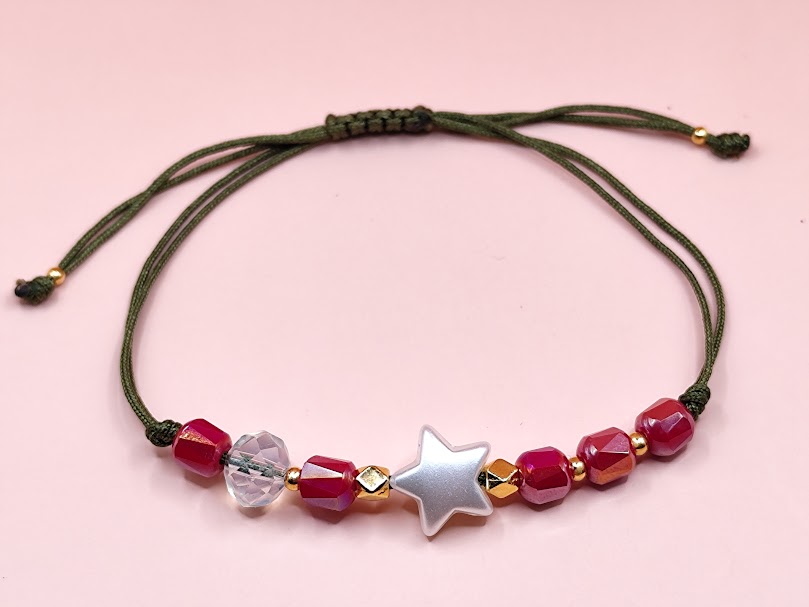 Χειροποίητο βραχιόλι με πέρλα σε σχήμα αστέρι, επιχρυσωμένες λεπτομέρειες και μπορντό κρύσταλλους σε πράσινο κορδόνι.